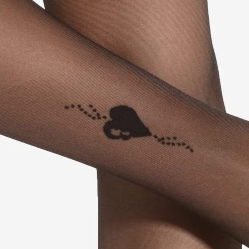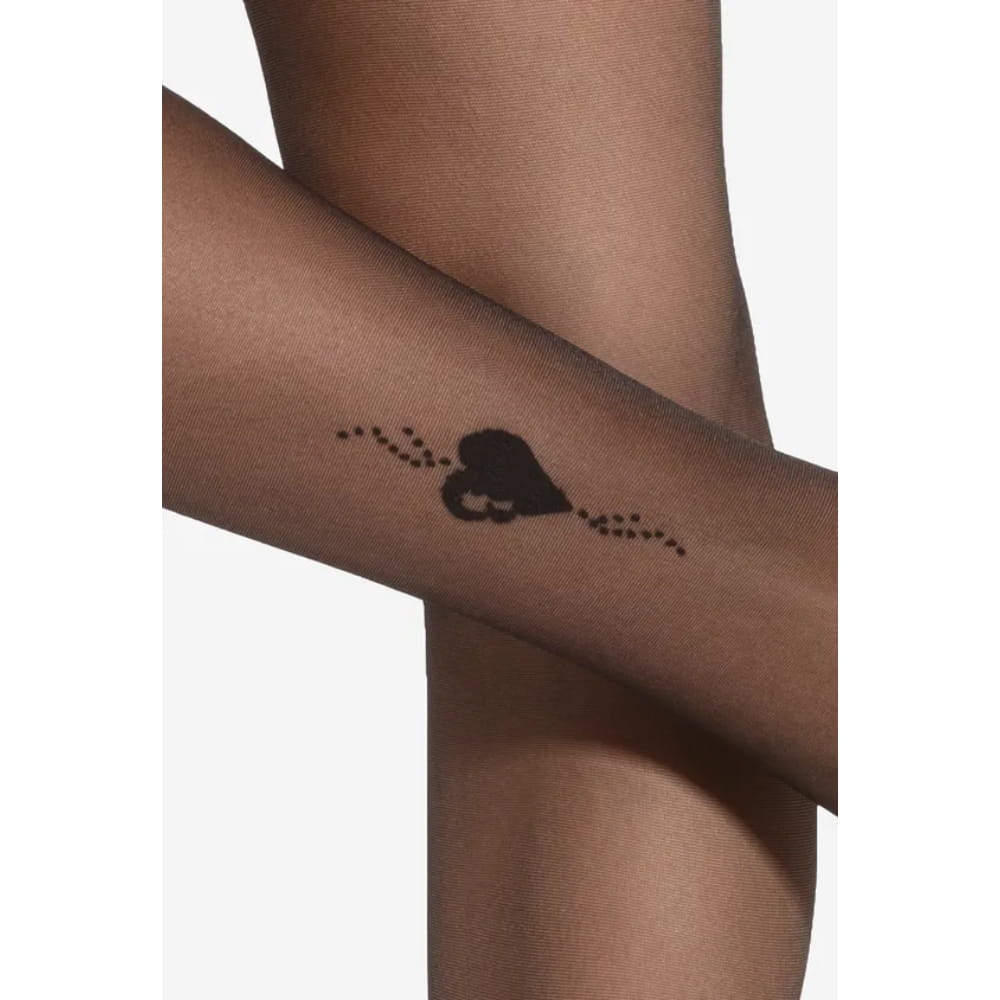 - Górna część pończochy wykończona jest koronką uzupełnioną od wewnątrz silikonowymi paskami, które zapobiegają zsuwaniu się pończoch. Wzór koronki to inspirowany kulturą bliskiego wschodu motyw paisley. Pończochy o grubości 20 Den posiadają półmatowe, bardzo eleganckie wykończenie. Oryginalnego charakteru nadaje im wzór serduszka umieszczony na boku łydki, który intrygująco zdobi nogi.