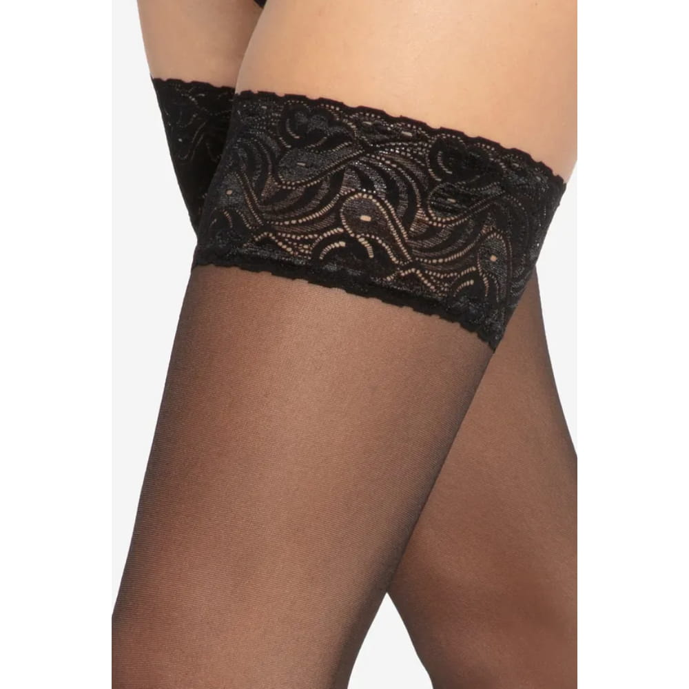 Pończochy damskie samonośne wykończone fantazyjną koronką z silikonem,