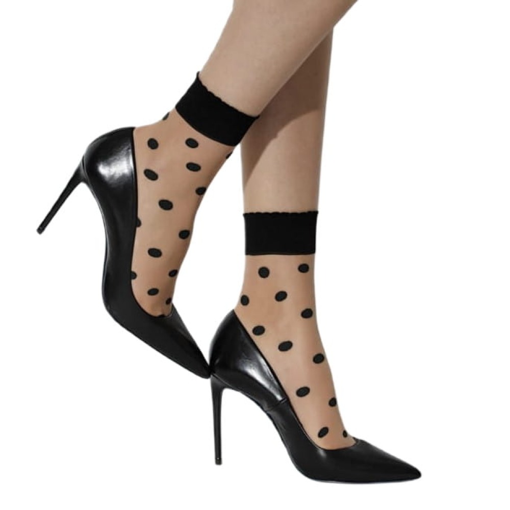 Zalotnie otula kostkę i motywem kropek to idealny wybór dla klasycznych jak i odważnych stylizacji. Dobrze przylegają do stopy nie tworząc brzydkich marszczeń. Szeroki ściągacz trzyma skarpetki na odpowiedniej wysokości i nie zsuwa się, co zwiększa komfort noszenia.