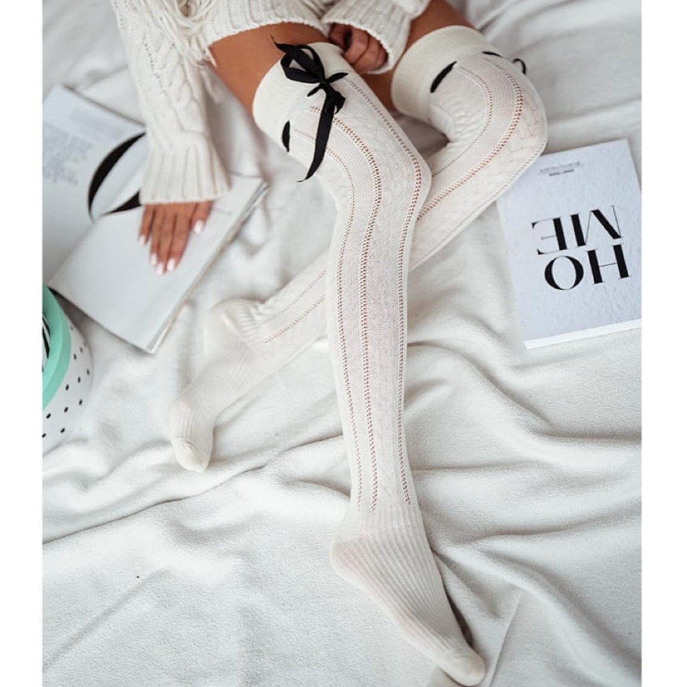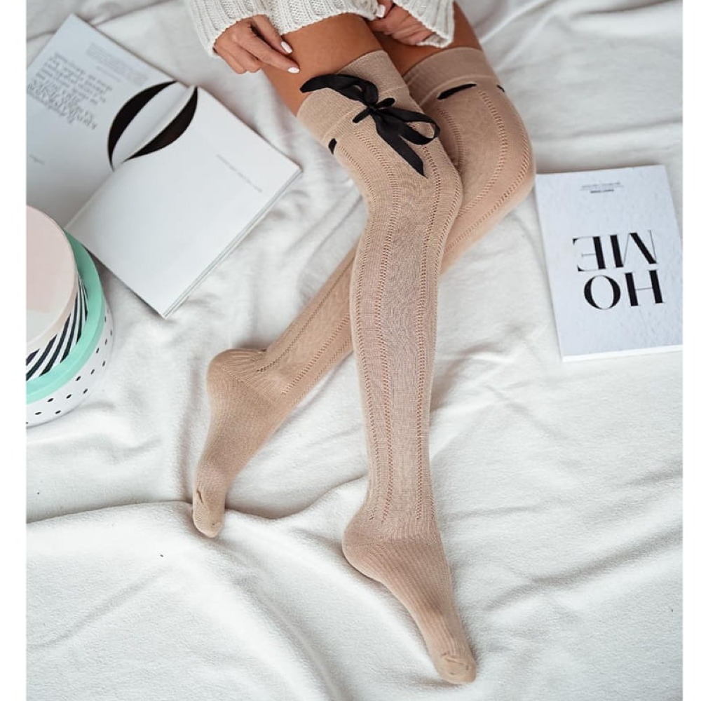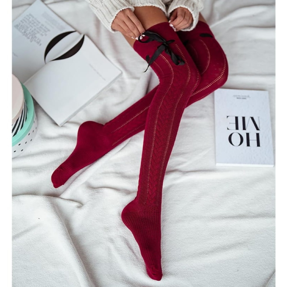 Długie damskie zakolanówki, wzór warkocz z rypsową wstążką, wiązaną na udzie. Doskonale dopasowują się do kształtów ciała, co sprawia, że są idealne na romantyczne wieczory. W tych zakolanówkach każda kobieta poczuje się zmysłowo i uwodzicielsko. Świetnie nadają się na chłodniejsze dni.